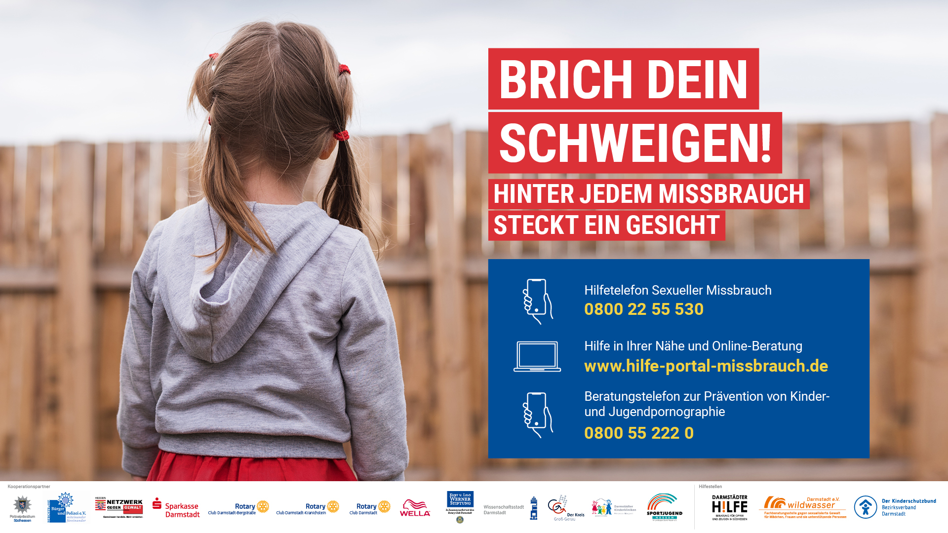 Unter dem Namen „Brich Dein Schweigen – hinter jedem Missbrauch steckt ein Gesicht“ haben der Verein Bürger und Polizei Bergstraße e. V., die Rotary Clubs der Region sowie das Polizeipräsidium Südhessen eine Kampagne initiiert mit dem klaren Ziel, Kinder und Jugendliche zu schützen und die Täterinnen und Täter zur Rechenschaft zu ziehen.